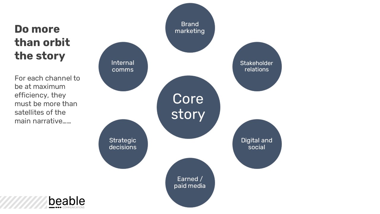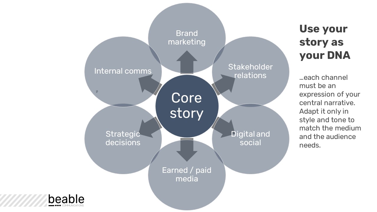 Your brand story must be in evidence whatever the audience, channel or objective. Develop and deploy your narrative strategically. Done well, it generates advocacy amongst staff, positive sentiment amongst stakeholders, and personal relationships with customers, each aiding delivery of core objectives.